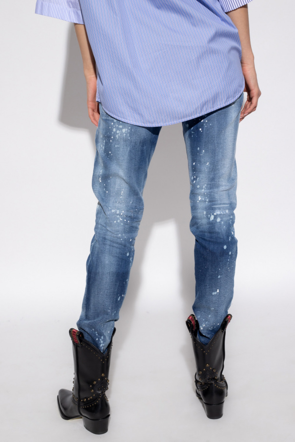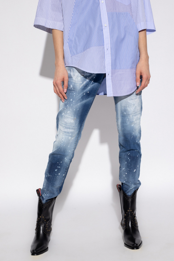 Blue ‘Skinny Dan Jean’ distressed jeans from Dsquared2. Fastened with buttons, this pair falls down with tapered legs and is complete with a white paint splatter effect, three front pockets and two back pockets.