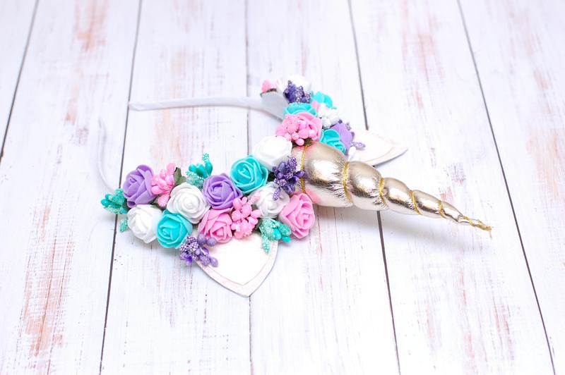 Яскравий обруч з золотим Єдинорогом чудово підійде для малятка або більш старшої дівчинки для свята або вечірки, дуже гарний, ошатний, ніжний, виготовлений акуратно і якісно. Ріг і вушка виконані з екошкіри. Обідок декорований квітами білого, рожевого, м'ятного і фіолетового кольору. Барвистий і яскравий, підійде під будь-який наряд