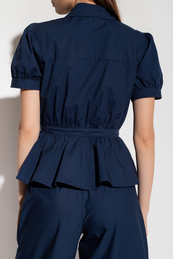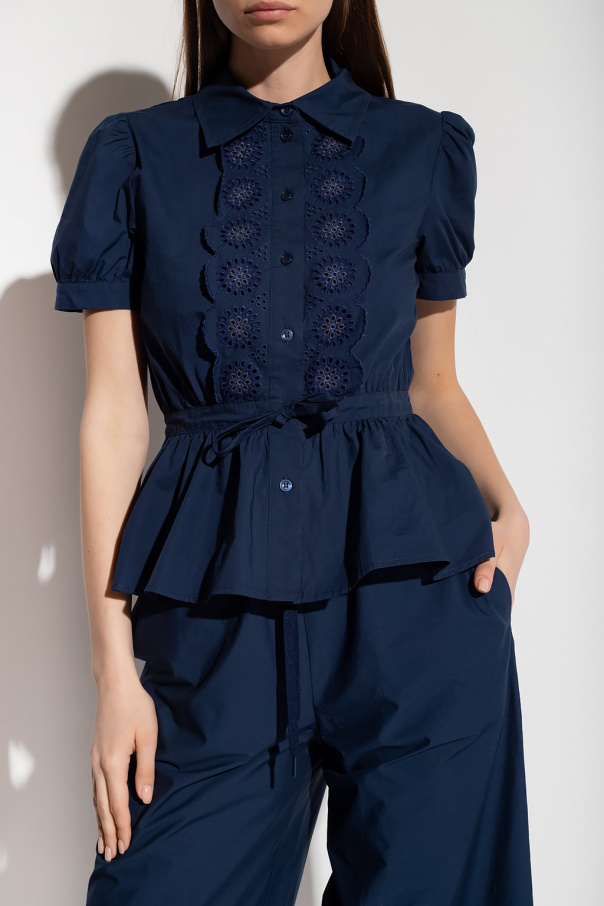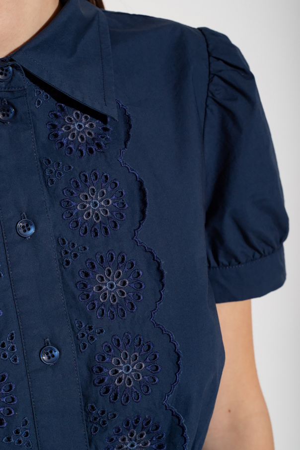 Short, navy loose-fitting dress from See By Chloé. Made of a cotton and elastane blend, this design features a panels with floral broderie anglaise, short puff sleeves and peplum hem.