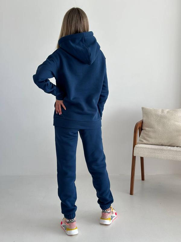Костюм спортивний: кофта вільного крою, плечовий шов приспущений, з кишенею кенгуру, подвійний капюшон, рукава на манжетах. Штани на резинці, висока посадка, з кишенями, штани внизу на резинці