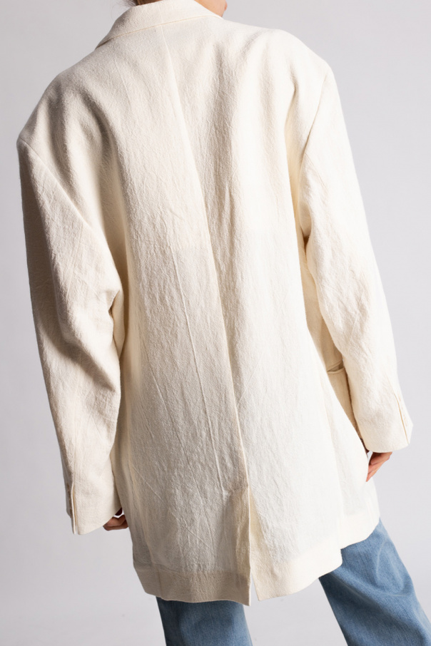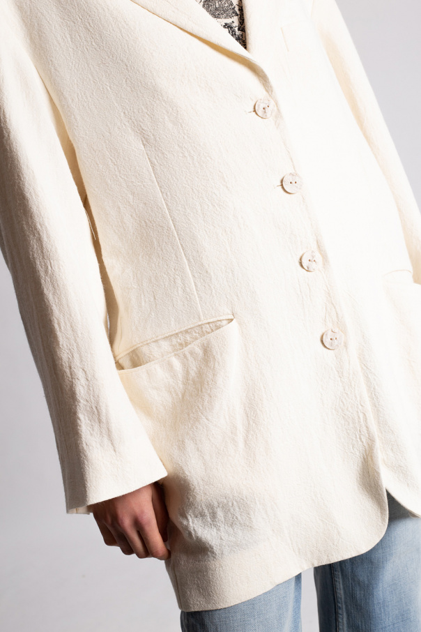Cream blazer with notch lapels from Acne Studios. Fastened with buttons, this design features three front pockets and a single rear vent.