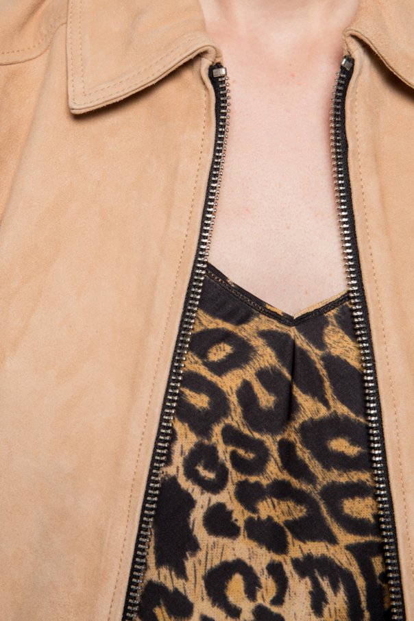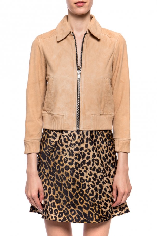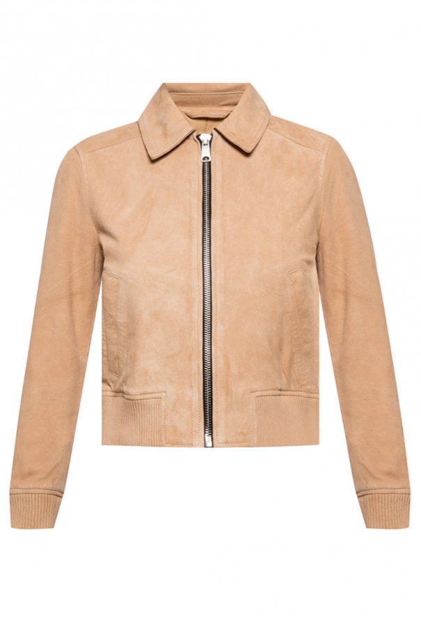 Beige ‘Azari’ jacket from AllSaints. Made of suede. Fastened with zip. It features 2 slip pockets on the front and an elasticated bottom hem and cuffs.