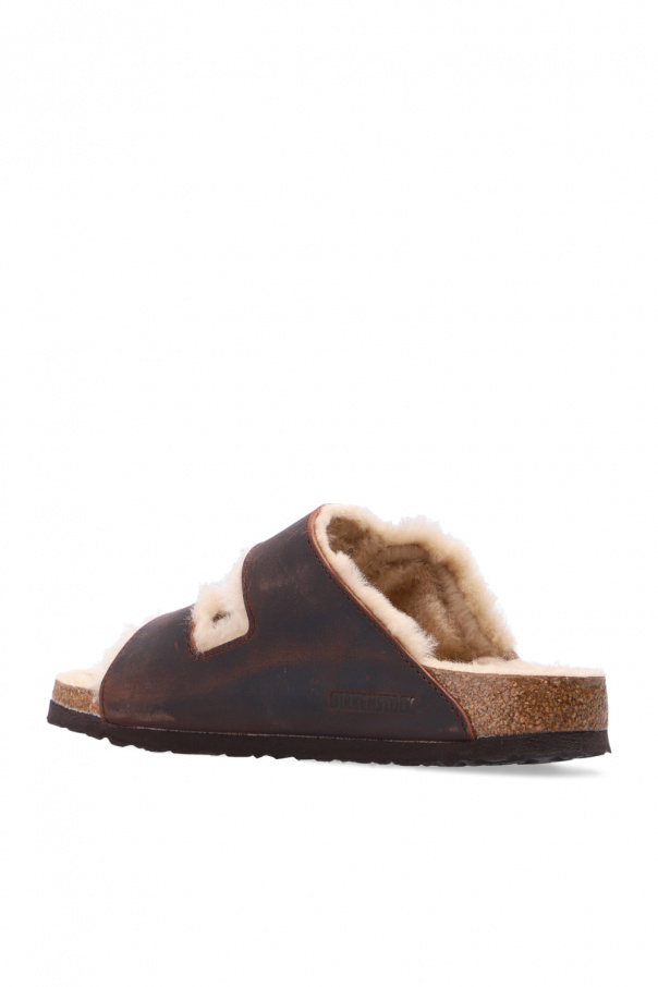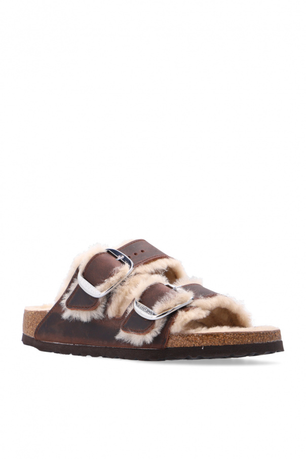 Dark brown ‘Arizona Big Buckle Shearling’ slides from Birkenstock. Crafted from waxed leather, this model features straps with a logo-embossed silver-tone buckle, shearling lining and dark brown sole made of cork and EVA foam.