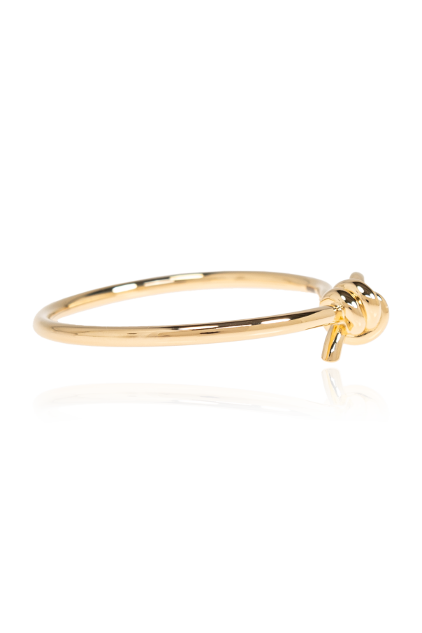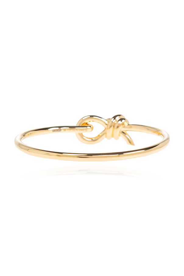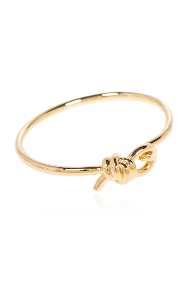 Introducing the Bottega Veneta Bracelet with Knot, a paragon of modern elegance and minimalist sophistication. This exquisite piece, crafted from sterling silver with a luxurious golden hue, embodies the distinguished aesthetic of Bottega Veneta. The bracelet features a sleek, rigid design with a striking knot detail on the front, offering a subtle yet captivating charm. Its smooth surface enhances its contemporary appeal, making it an ideal accessory for refined ensembles. Why Choose This Product? Designed by the renowned Bottega Veneta, a trailblazer in the realm of innovative craftsmanship since 1966. Meticulously crafted from sterling silver with a sophisticated gold finish. Features a unique knot detail, adding a subtle touch of elegance. Perfectly complements elegant and modern attire.