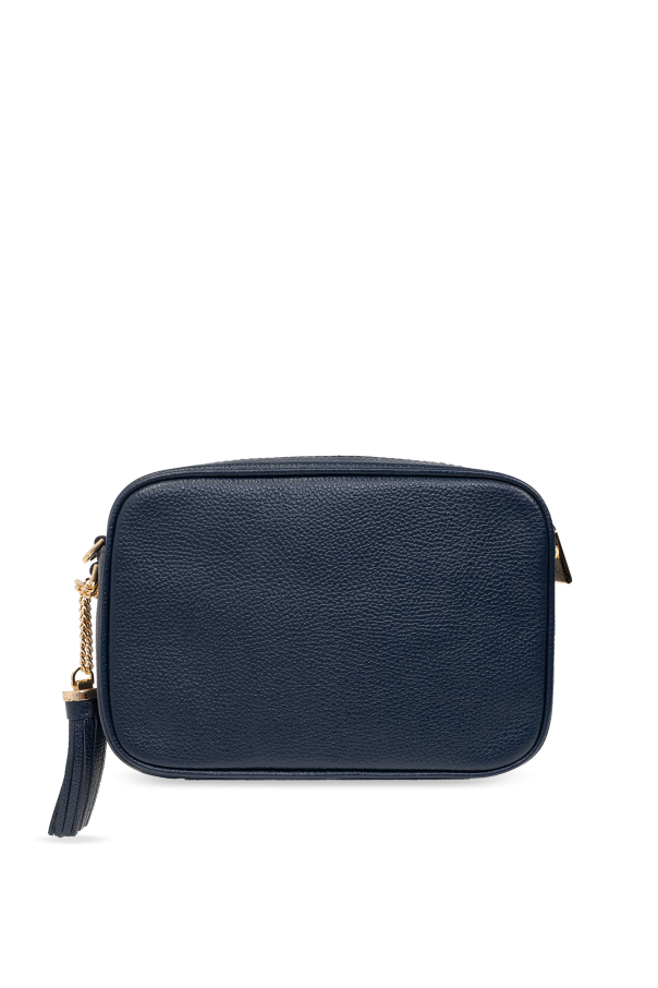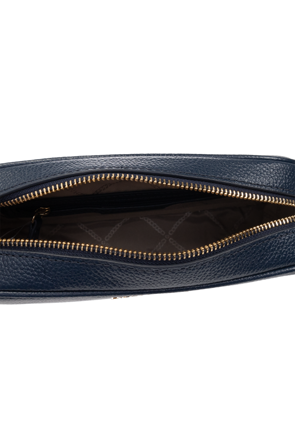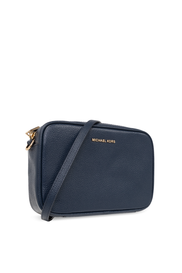 Navy blue shoulder bag from Michael Michael Kors. Crafted from cow leather, this design secures with a zipper and features a logo application. It is complete with an adjustable shoulder strap, gold-tone metal hardware and one internal compartment.