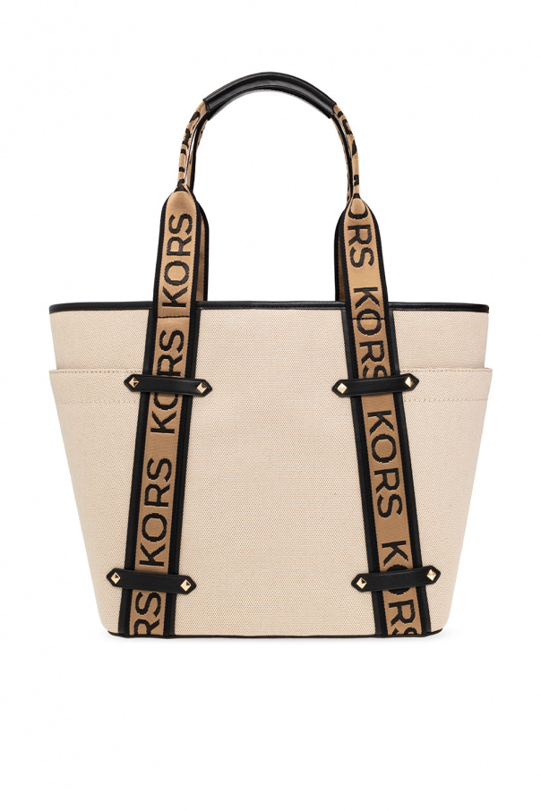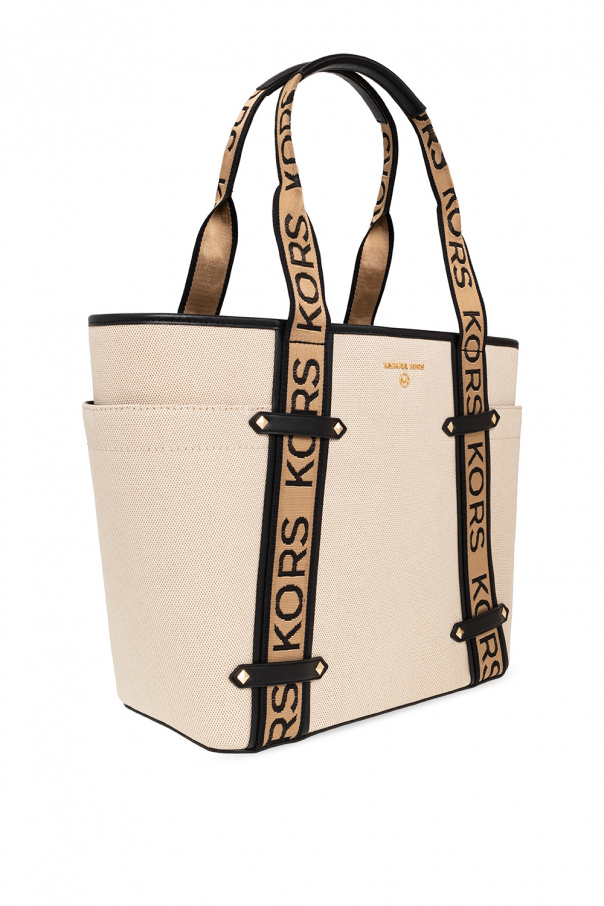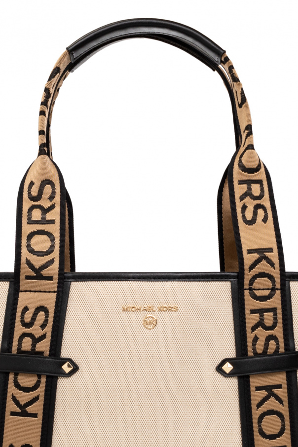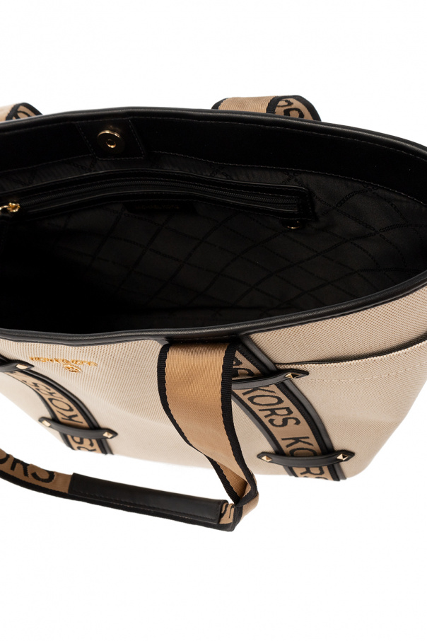 Beige and black ‘Maeve Large’ shopper bag from Michael Michael Kors. Distinguished by a metal logo plaque on the front, this design features a magnetic snap closure, slip pockets on the sides, two branded handles, gold-tone metal hardware and a black-clad interior with one compartment, two slip pockets and one zip pocket.