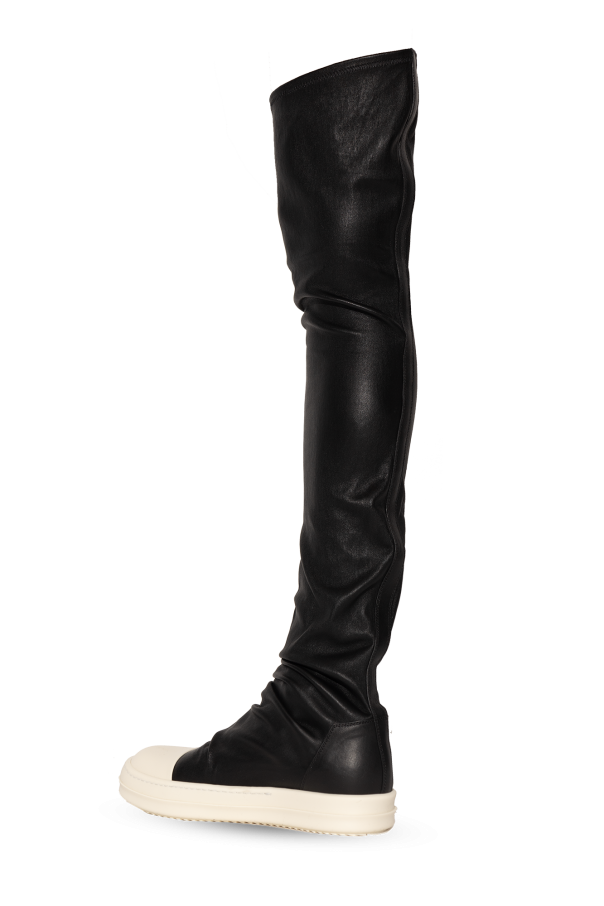 Black and cream over-the-knee boots from Rick Owens. Made of leather, this model sits on a cream rubber sole.