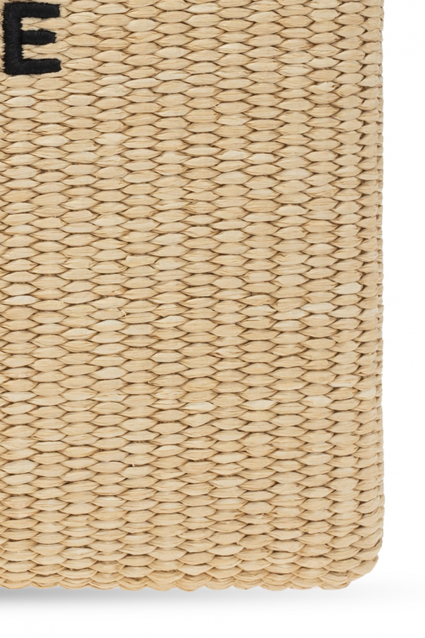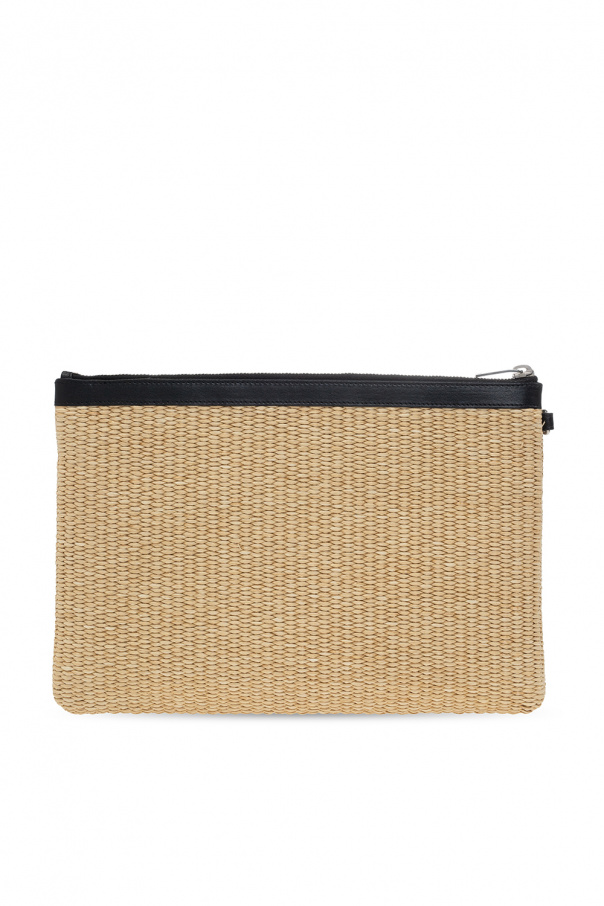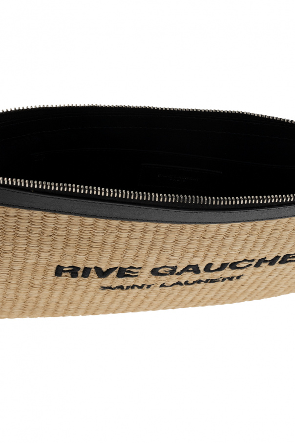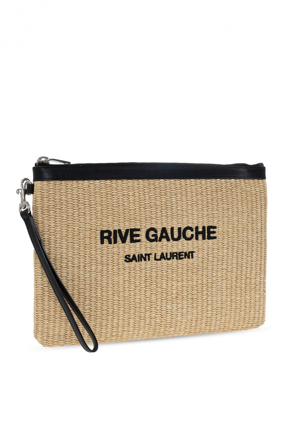 Beige clutch from Saint Laurent. Embroidered with a beige pattern, this item secures with a zip and features black cow leather trims, a detachable half-round handle, silver-tone metal hardware and one internal compartment with a slip pocket.