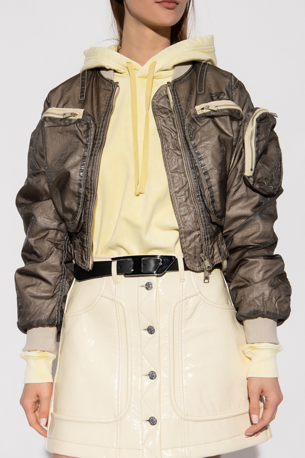 Green and cream \'G-Khloe-A\' jacket from Diesel. Crafted with a cropped, regular fit, this style features a green see-through organza outer layer, a zip fastening, logo detailing, four oversized zipped pockets (two on the sleeves) and ribbed trims on the collar, bottom hem and cuffs.