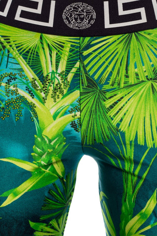 Blue and green leggings from Versace. Decorated with a printed pattern. Black elasticated waistband featuring an embroidered Medusa head pattern. 3/4 length legs.