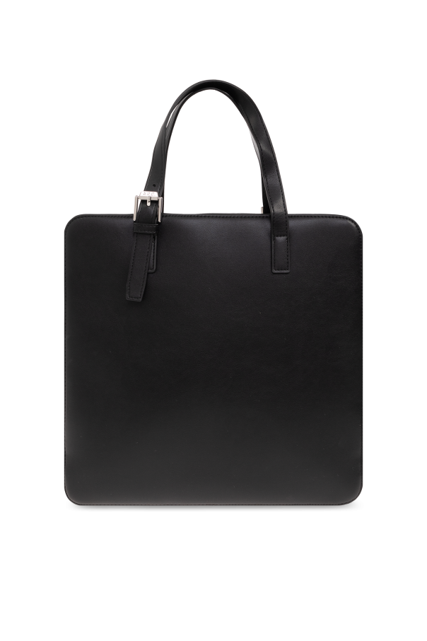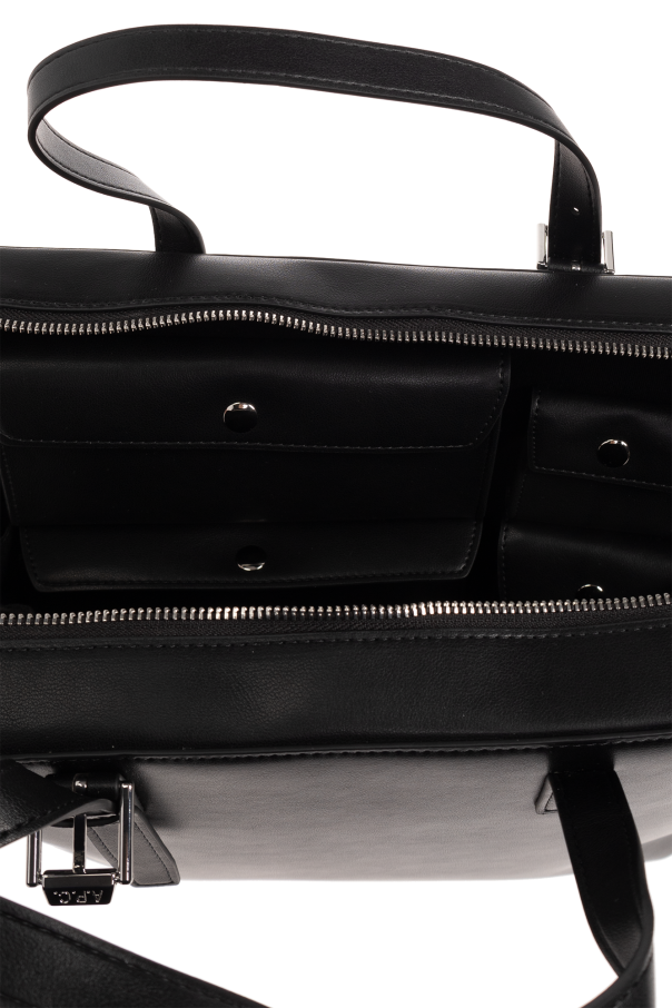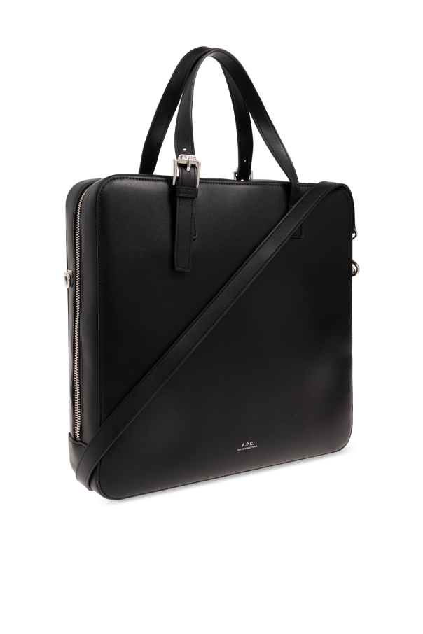 Black ‘Ninio’ briefcase from A.P.C. Fastened with a two-way zip, this design features a silver-tone logo, two half-round handles, detachable and adjustable shoulder strap and one internal compartment with two slip pockets and four snap-fastened pockets.
