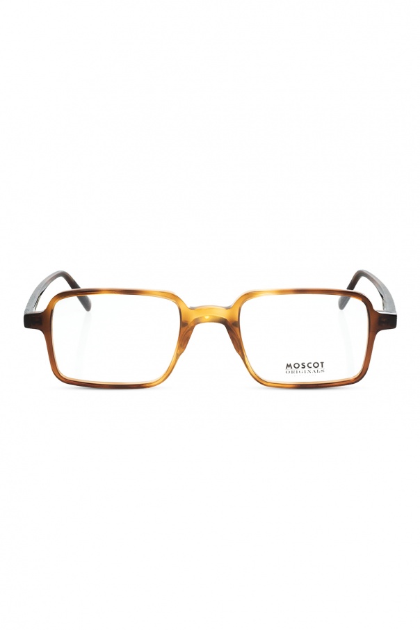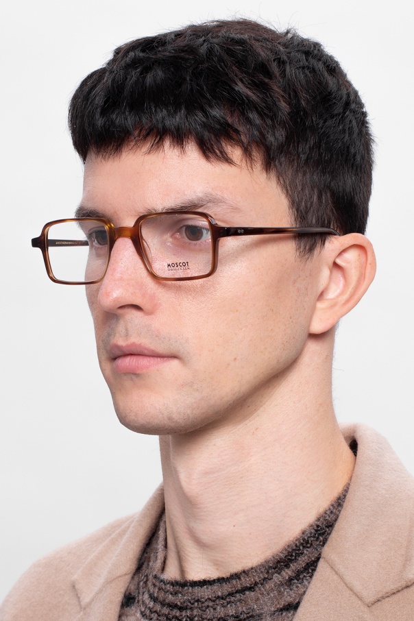 Brown and black ‘Shindig’ eyeglasses from Moscot. This handcrafted model comes with a case and a canvas bag with a logo print in grey and yellow.