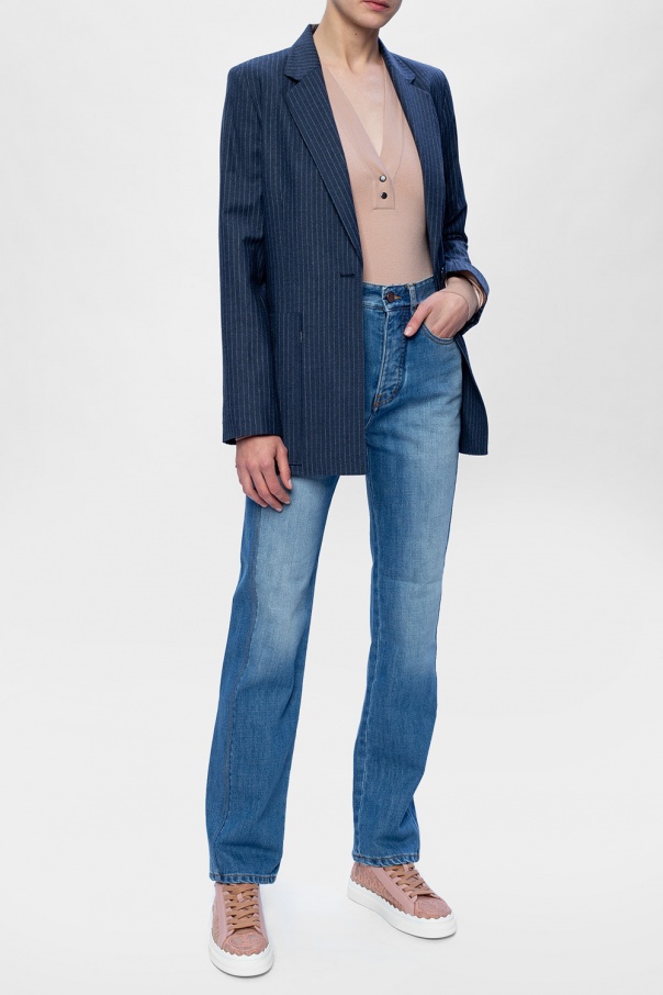 Pink ‘Lauren’ lace-up sneakers from Chloé. Crafted from lace, this model features oversized pull tabs with a white logo print and a white rubber sole.