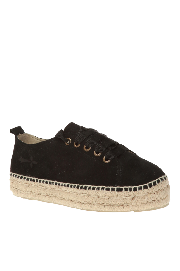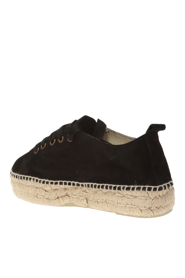 Black lace-up \'Hamptons\' espadrilles from Manebi. Decorated with a woven insert. Beige rubber sole.