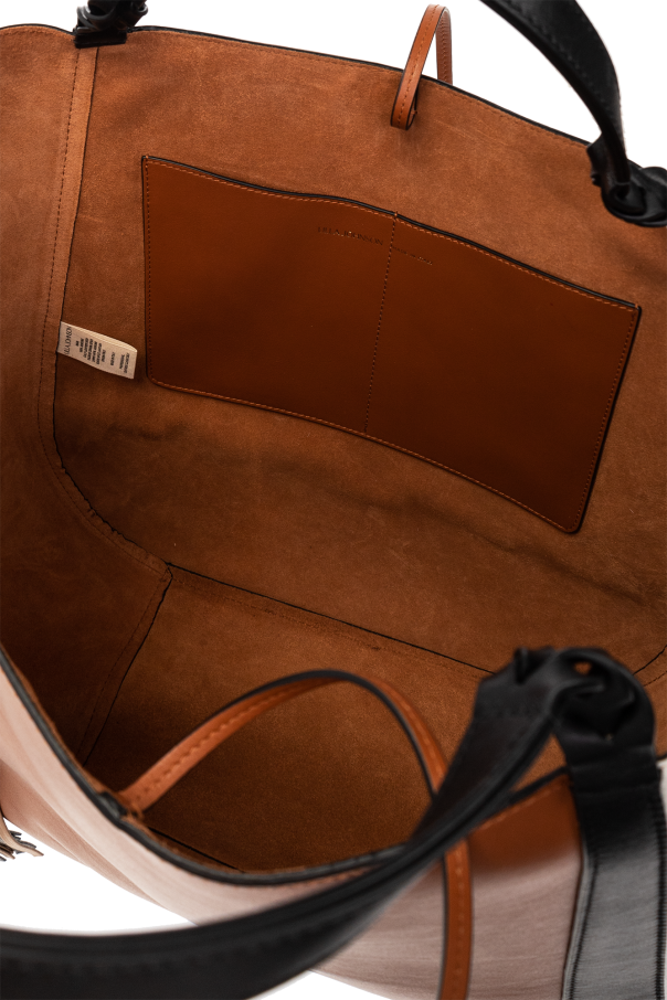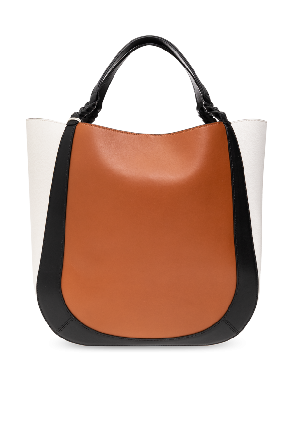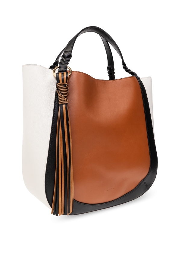 Brown, white and black ‘Albers’ shopper bag from Ulla Johnson. Crafted from grained and smooth leather, this design cinches closed with drawstrings and features an embossed logo on the front. It is complete with a detachable gold-tone tassel charm, two braided handles and one internal compartment with two slip pockets.