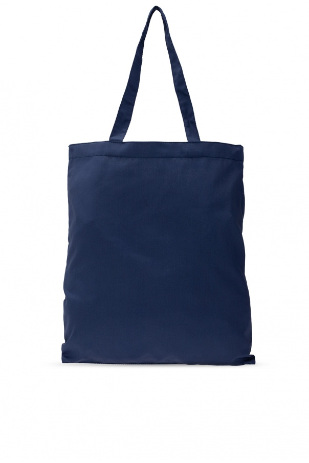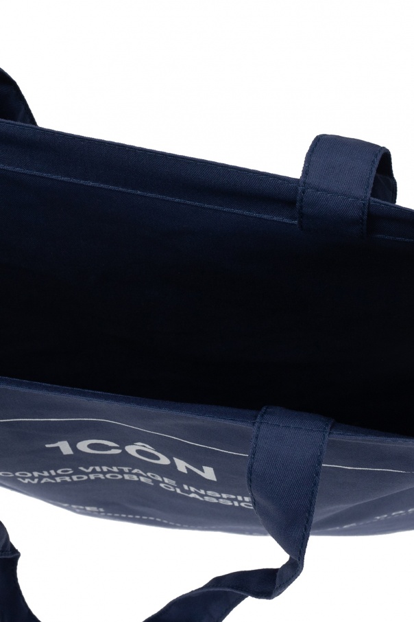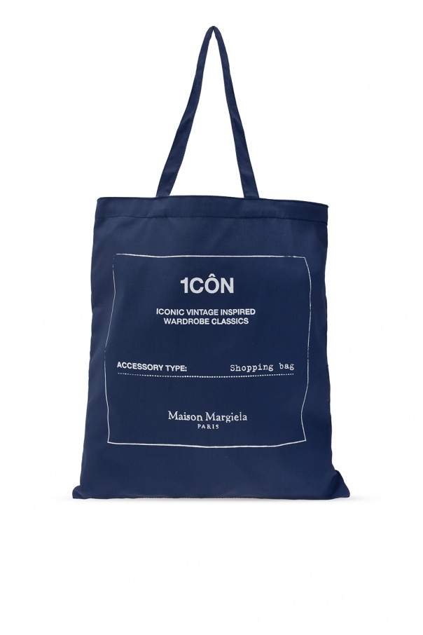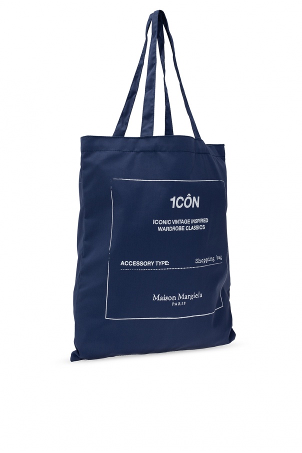Navy bag from Maison Margiela. Crafted from cotton, this design features a printed logo pattern in white, two half-round handles and one internal compartment.