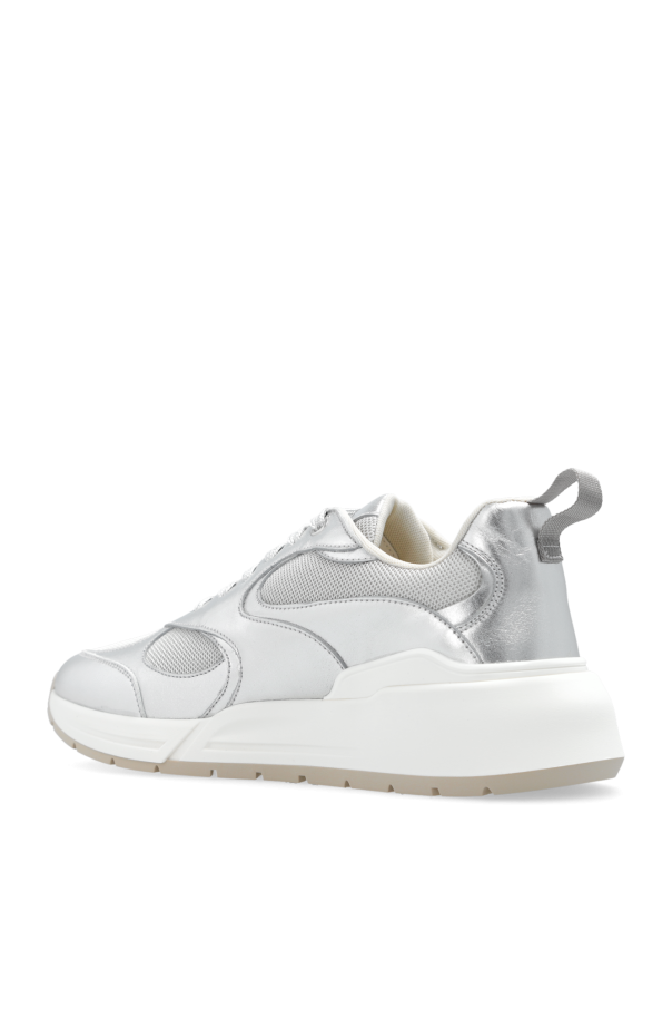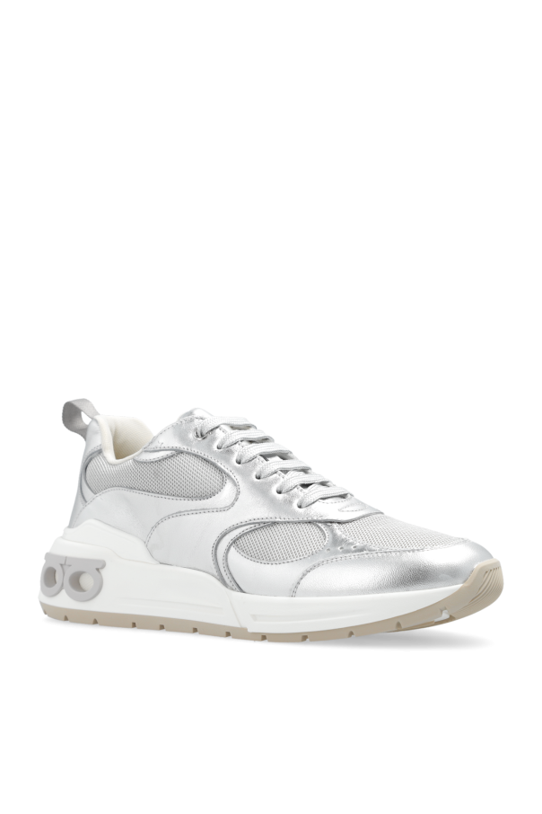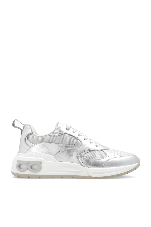 Silver-tone ‘Cosma Lux’ sneakers from FERRAGAMO. Made from leather, this lace-up model sits on a grey and white rubber sole accentuated with a logo and features a medium insole, fabric overlays and a black logo printed on the tongue.