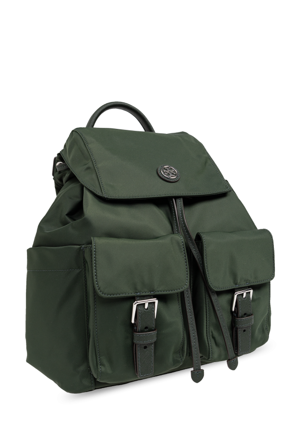 Introducing the Virginia Backpack by Tory Burch, an epitome of elegant functionality and timeless design. Crafted from high-quality, durable canvas, this backpack is designed to withstand the rigors of daily use while maintaining its sophisticated aesthetic. Its rich, dark green hue exudes an air of exclusivity and refinement. The Virginia features a classic construction with two front flap pockets secured by buckle closures, allowing for easy access to essentials. The main compartment is secured by a drawstring and an additional flap with a metallic designer logo, marking it as a distinguished Tory Burch product. An upper hand strap offers an alternative carrying option, enhancing its versatility. Comfort is not compromised, thanks to its wide, adjustable shoulder straps ensuring a comfortable fit. Metal elements, including zippers and sliders, are thoughtfully color-matched to the backpack, showcasing meticulous attention to detail. The backpack\'s rear is equipped with adjustable strap bands, catering to personalized fit preferences. Interiorly, it boasts a zipped pocket and a slip pocket, ideal for safeguarding valuable items. Why Purchase the Virginia Backpack? Exceptional durability and quality, thanks to its high-grade canvas material. Stylish and functional design with easy-access pockets and secure closures. Signature Tory Burch elegance with a distinctive logo embellishment. Versatile carrying options for enhanced comfort and utility. Interior compartments for organized storage of valuables.