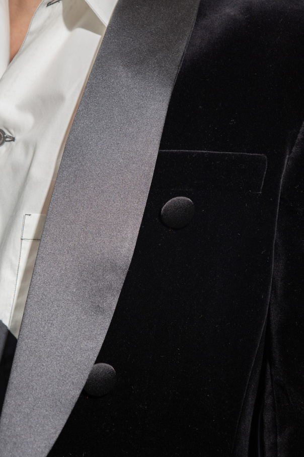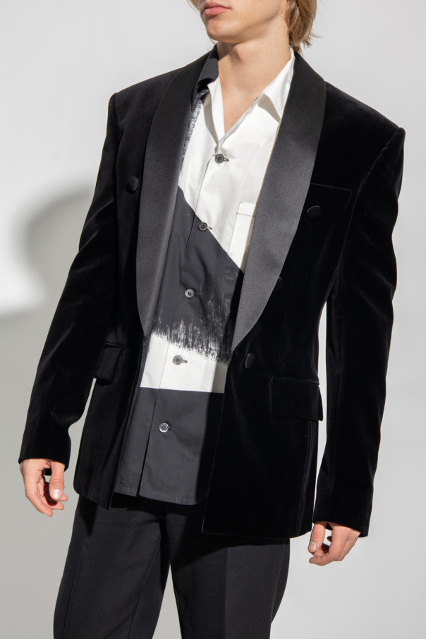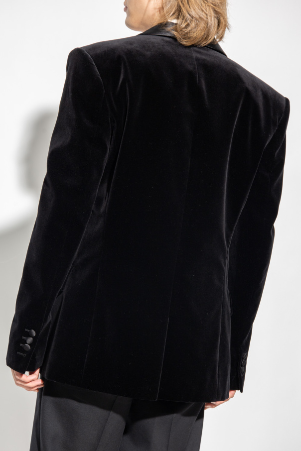Black blazer from Balmain. Rendered in velvet fabric, this style features a satin trim, one slip pocket and two flapped pockets on the front, a single back vent and long sleeves.