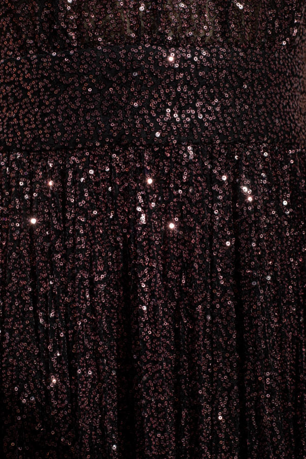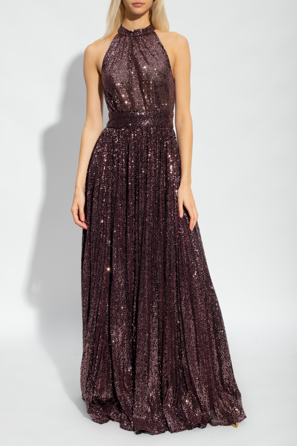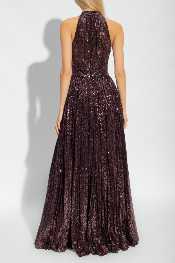 Dark pink and black dress from Dolce & Gabbana. Crafted from sequinned material, this style features a halter neckline, snap closures, a hidden zipper at the back, a fitted waist and a flared hem with pleats.