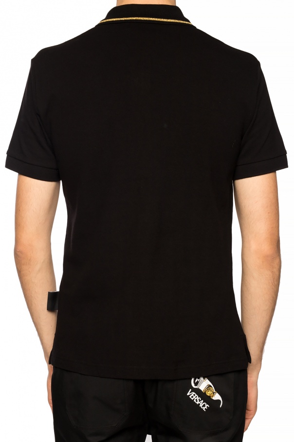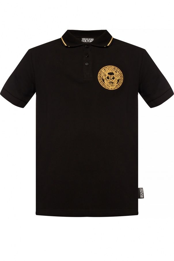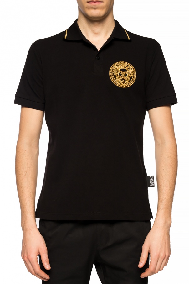 Black short-sleeved polo from Versace Jeans Couture. Made of cotton. Fastened via buttons. Embellished with a pattern embroidered with gold-tone lurex yarn on the front.