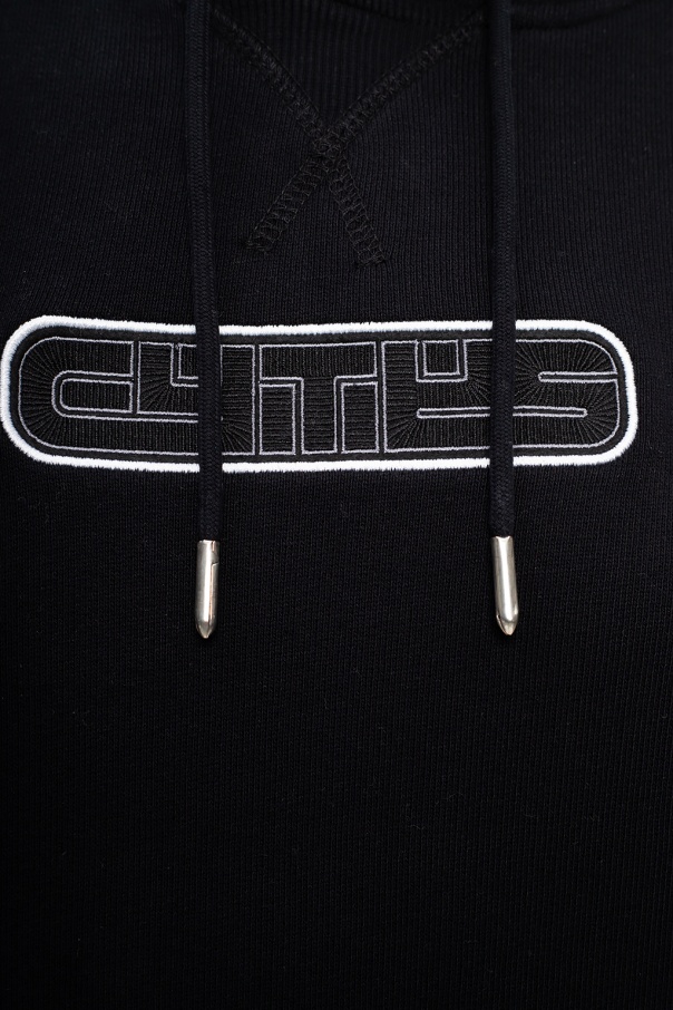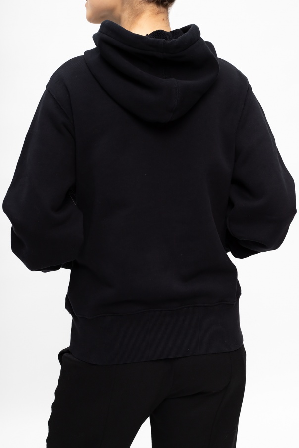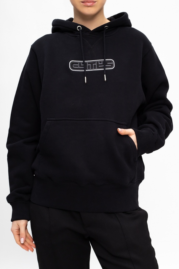 Black sweatshirt with a drawcord-adjustable hood from Eytys. Boasting a white and grey branded patch, this cotton-crafted hoodie is complete with a kangaroo pocket and a ribbed bottom hem and cuffs.