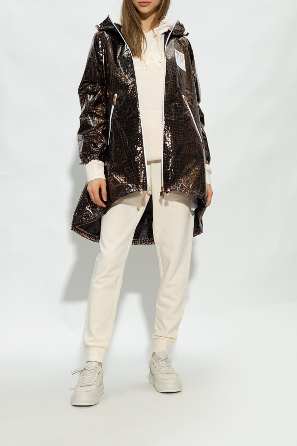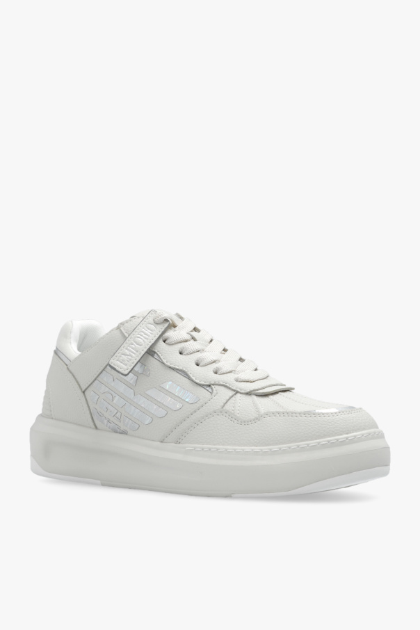 Cream sneakers from Emporio Armani. Crafted in part from leather, this lace-up model sits on a cream rubber sole and showcases the brand\'s logo and silver-tone inserts.