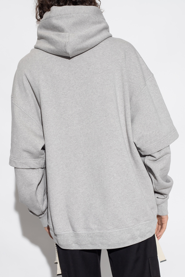 Grey oversize hoodie from KHRISJOY. Made of cotton, this design features a hood with snap fastening, front pocket, long sleeves with ribbed cuffs and white logo-printed drawstrings at the hem.