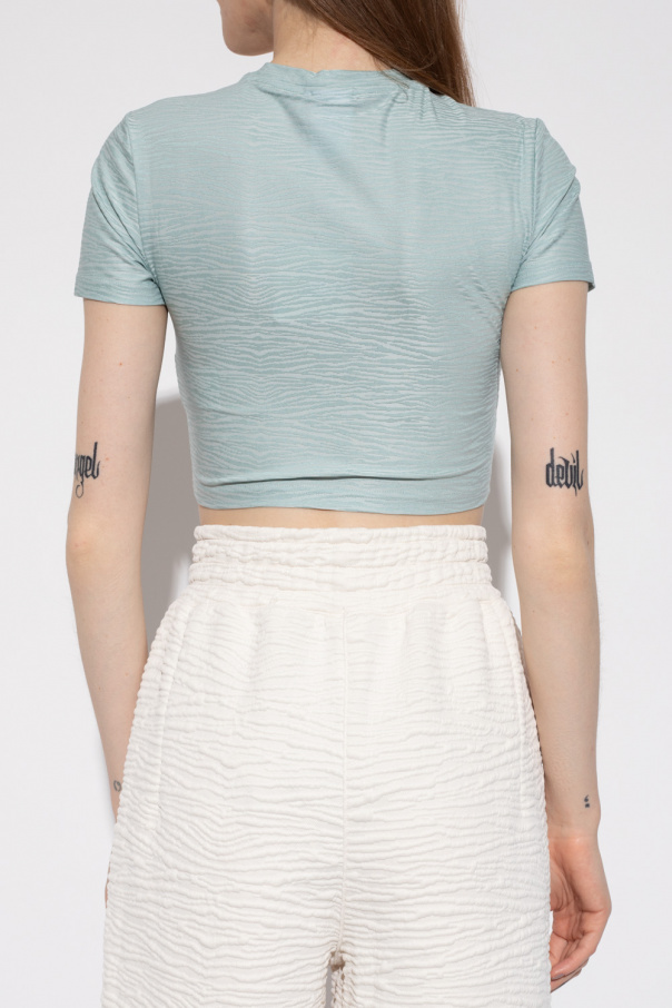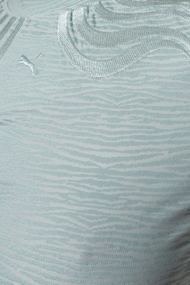 Light blue cropped T-shirt from Puma, the ‘Snow Tiger’ collection. Made of recycled Bluesign® certified material, this model features a jacquard pattern inspired by a snow tiger's unique and beautiful stripes, embroidered stripes at the neck, ‘Puma Cat’ logo, ribbed crew neck and short sleeves.