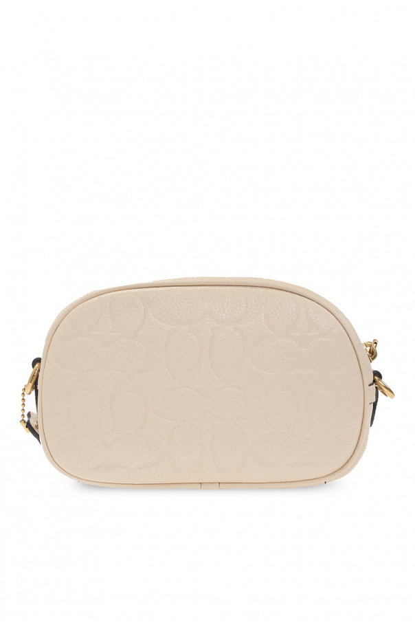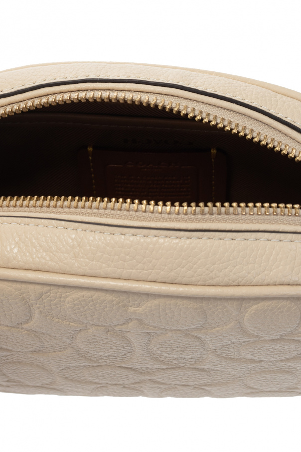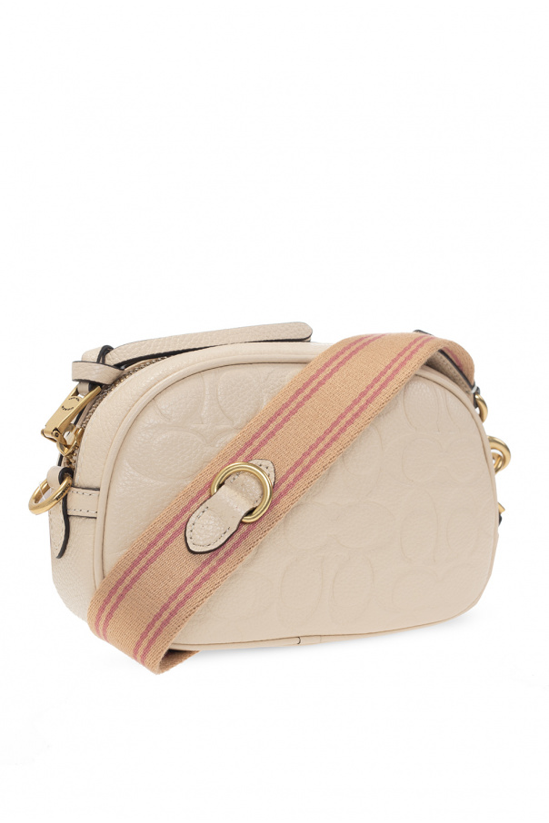 Cream shoulder bag from Coach. Crafted from leather, this model features a zip fastening, embossed logo, detachable and adjustable fabric strap in beige and pink, gold-tone metal hardware and one internal compartment with one slip pocket and two card slots.