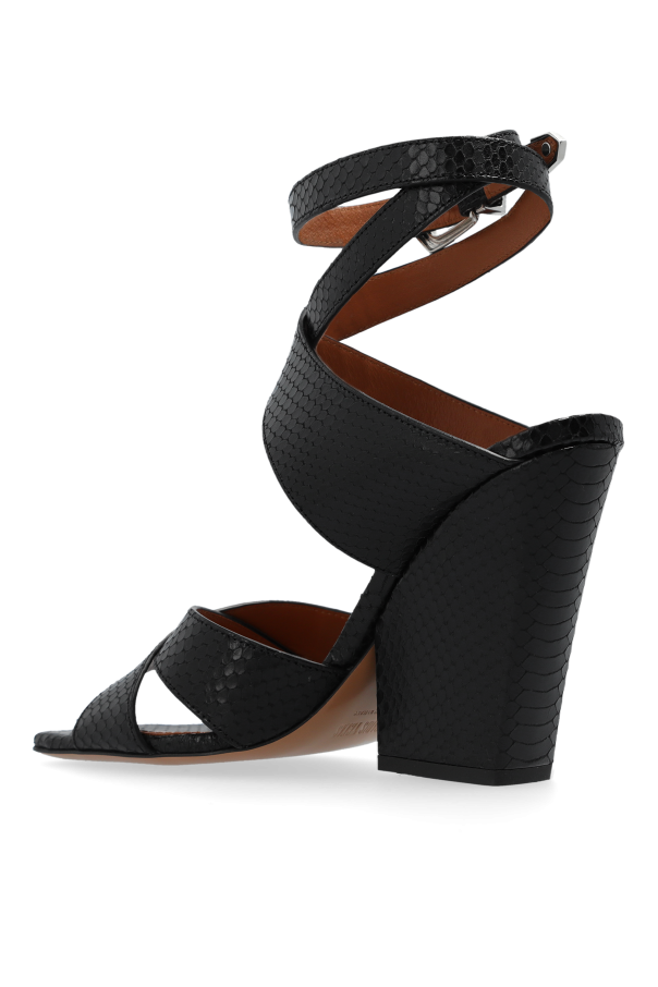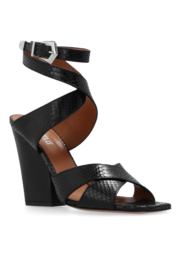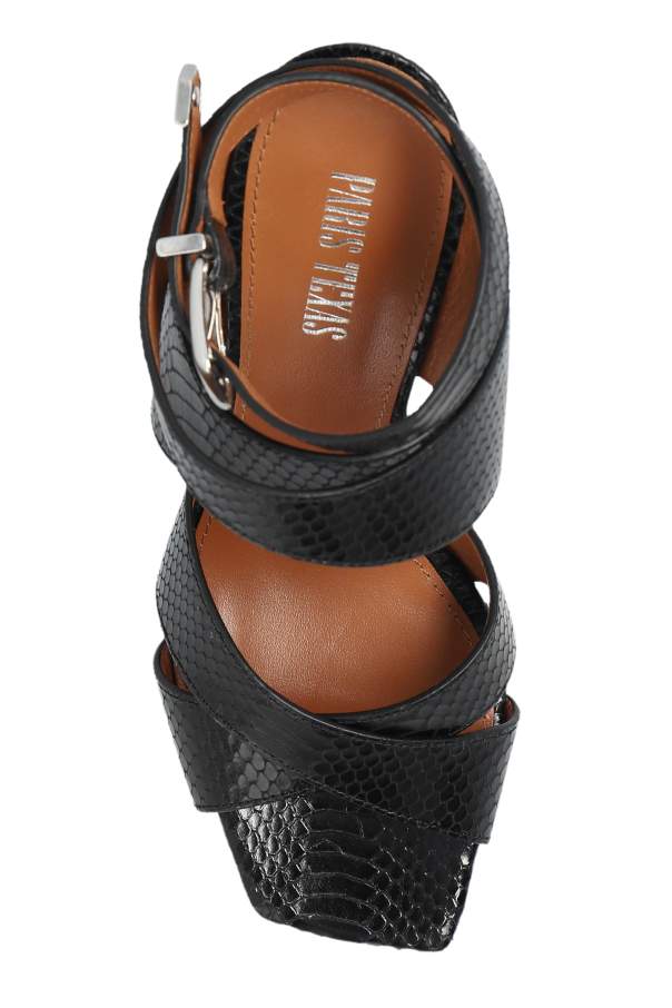 Introducing the \'Arizona\' Heeled Sandals by Paris Texas, a symphony of elegance and contemporary design. Crafted with a meticulous eye for detail, these sandals epitomize luxury with their snake-skin like texture and robust medium-height heel, offering both comfort and a statement of extravagance. The dominant black hue of the sandals is complemented by a striking silver buckle, allowing for an adjustable fit around the ankle, while the caramel-colored insole provides a delightful contrast, enhancing their aesthetic appeal. The crisscross straps not only exude modern sophistication but also ensure stability for the wearer, making these sandals a perfect amalgamation of function and fashion. Why Purchase This Product? Exquisite Design: The snake-skin texture and crisscross straps create a uniquely modern look. Comfort and Stability: A solid, medium-height heel offers day-long comfort and stability. Luxurious Materials: Crafted from 100% leather, these sandals promise durability and opulence. Adjustable Fit: A sleek silver buckle ensures a perfect fit, catering to your comfort needs. Versatile Style: Elegant enough for formal wear yet versatile for casual outings, these sandals adapt to various fashion needs.