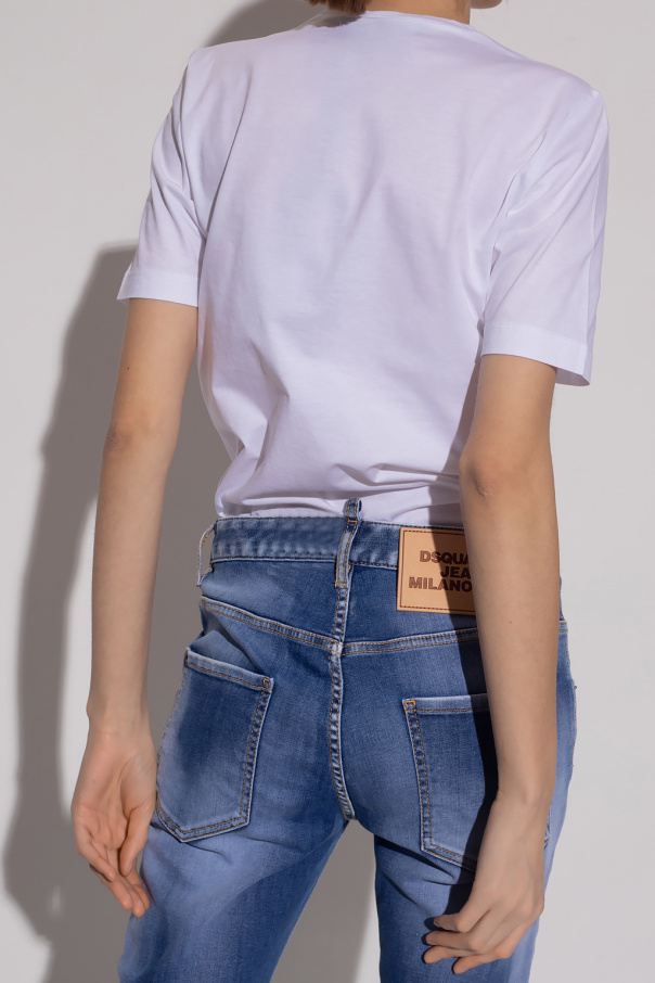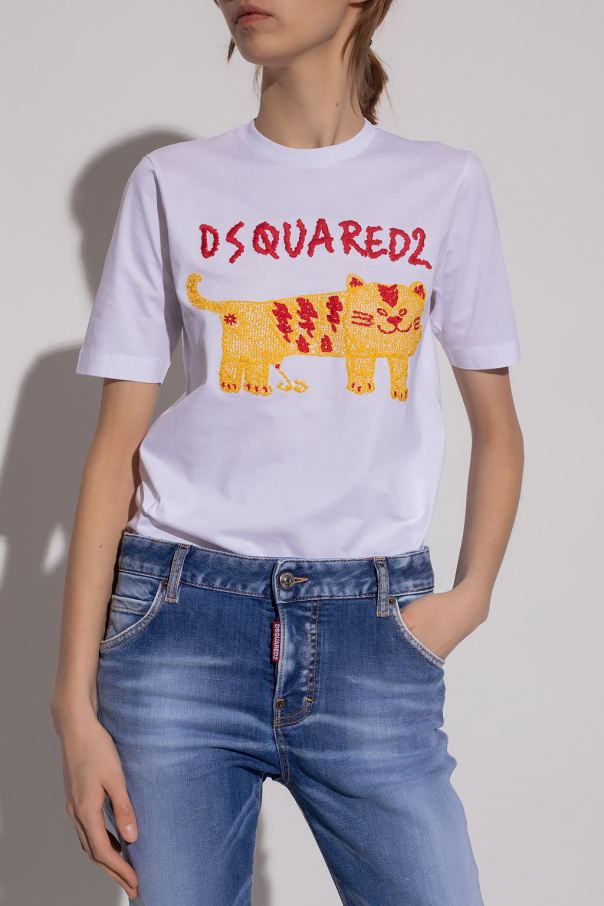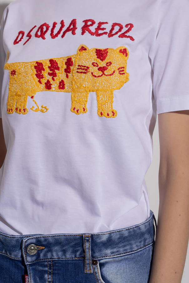 White crewneck T-shirt from Dsquared2. Crafted from cotton, this style features short sleeves, an elasticated collar and graphic embroidery with an animal motif and the brand\'s logo on the front.