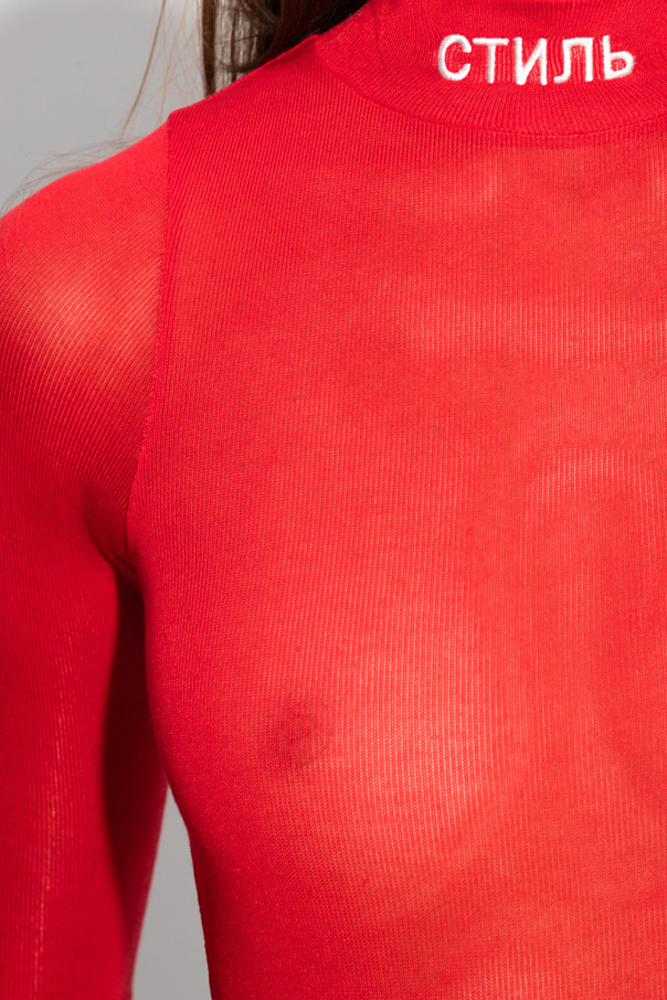Red body with a mock neck from Heron Preston. Fastened with snaps, this garment features a mock neck and long sleeves with a white logo embroidery and a patch.