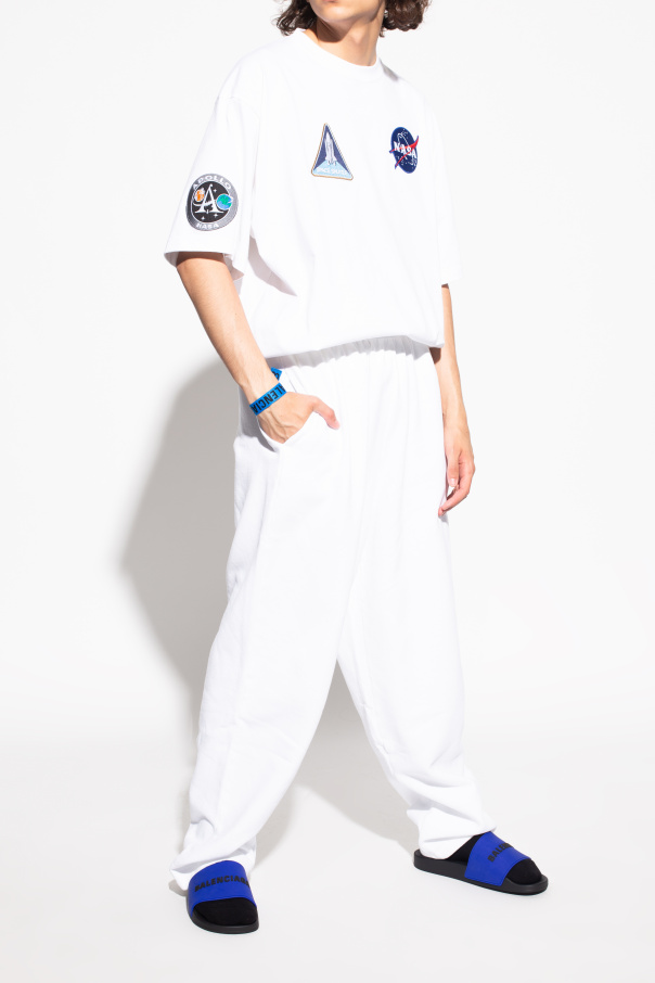 Dark blue ‘Pool’ slides from Balenciaga. Set on a black rubber sole, this pair is enriched by a raised logo appliqué in black.