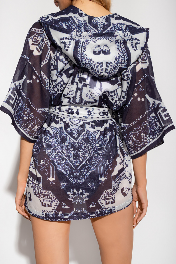 Blue and navy blue beach kimono with a hood from Balmain. Crafted from cotton with a semi-sheer finish, this style features a graphic pattern, short sleeves, a white logo print on the side and an attached tie belt.