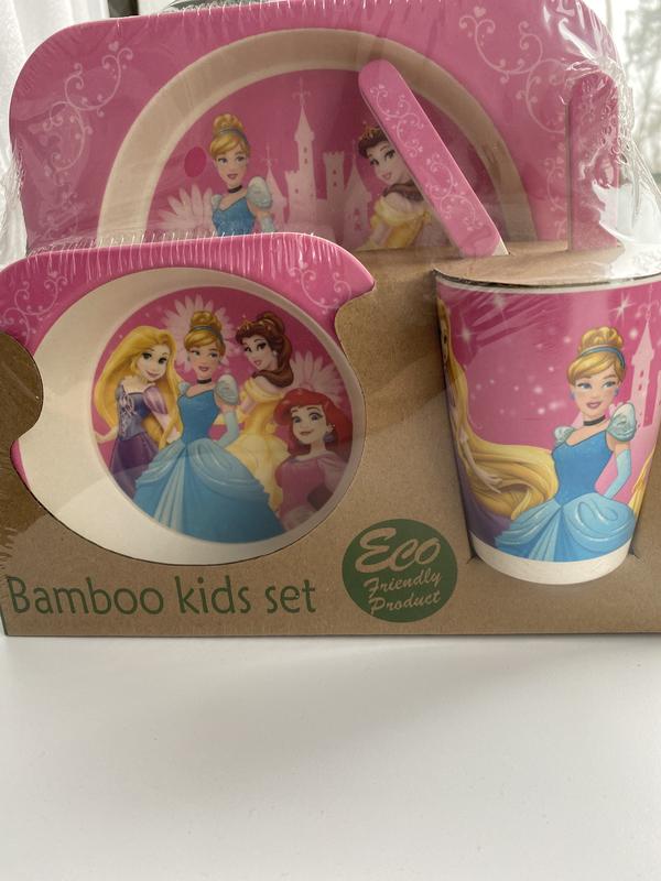 Комплектація (5 предметів): велика тарілка з роздільником: 21.4х21.4 см; глибина: 2.5 см; глибока миска: 14.3х14.3 см; глибина: 4 см; стакан: висота: 9.6 см, діаметр: 7 см; довжина столових приборів: 13.5 см.Відправка Укр та Нова пошта