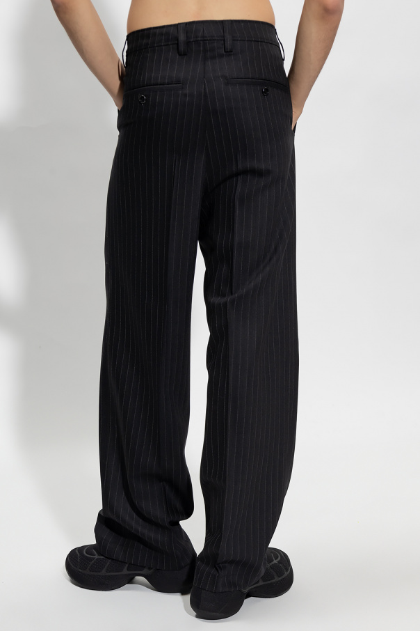 Black pleat-front trousers from Ami Alexandre Mattiussi. Crafted from merino wool, this wide leg design features a button and hook closure, embroidered pinstripe pattern, two front pockets, two buttoned back pockets and wide legs.