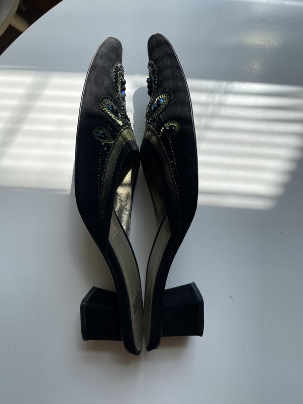 Качественный и жидкий винтаж- так можно их описать. Они в почти новом состоянии. Количество одеваний видно на фото. Никакой замены подошвы и набоики. Все родное. Все ткани и вышивка являются натуральные. Замша, кожа, шелк и чешкий бисер. Замша благородна, гладка . На размер 37,5-38. Учитывая узкий нос, стелька 26 см. Что значит, что где-то до 25 см. Предоставляется нога. Легкие и удобные. 2500 грн. Качественный французский бренд. У меня такие же на каблуке и тоже с вышивкой, оставила ))).