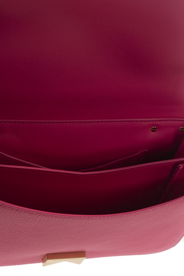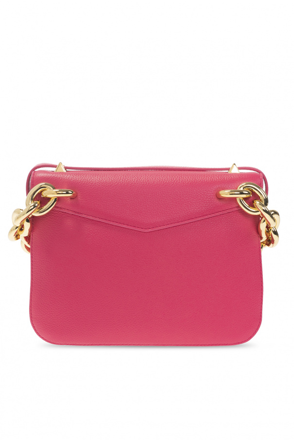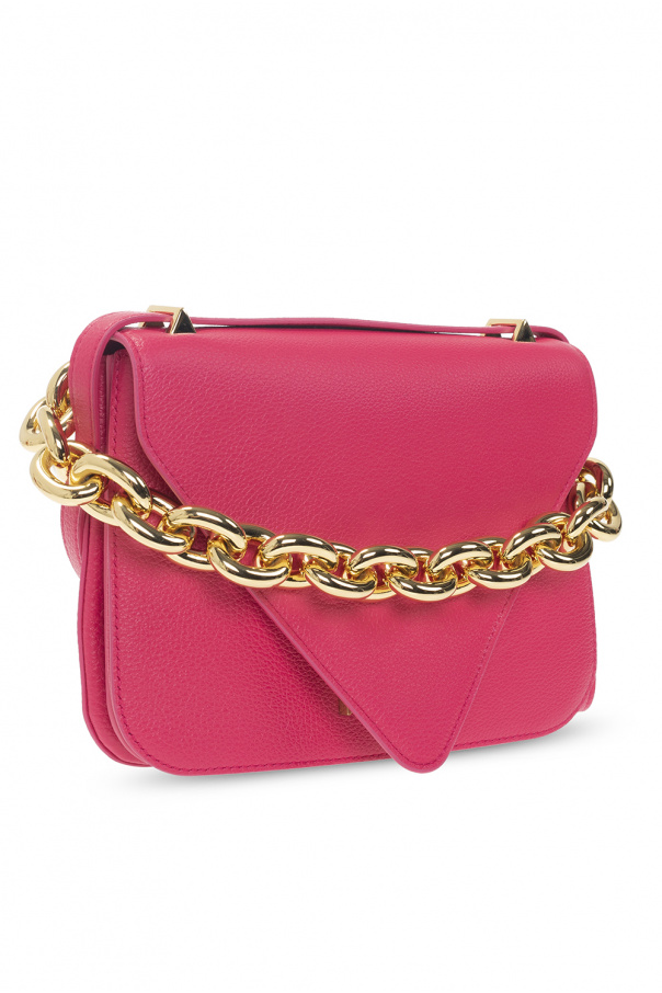Pink ‘Mount Small’ shoulder bag from Bottega Veneta. Crafted from leather, this design features a logo-embossed snap closure, a half-round chain handle, an adjustable strap, gold-tone metal hardware and an interior with two separate compartments and one slip pocket.