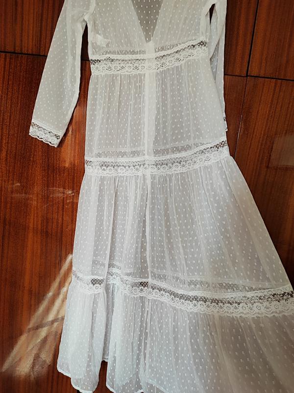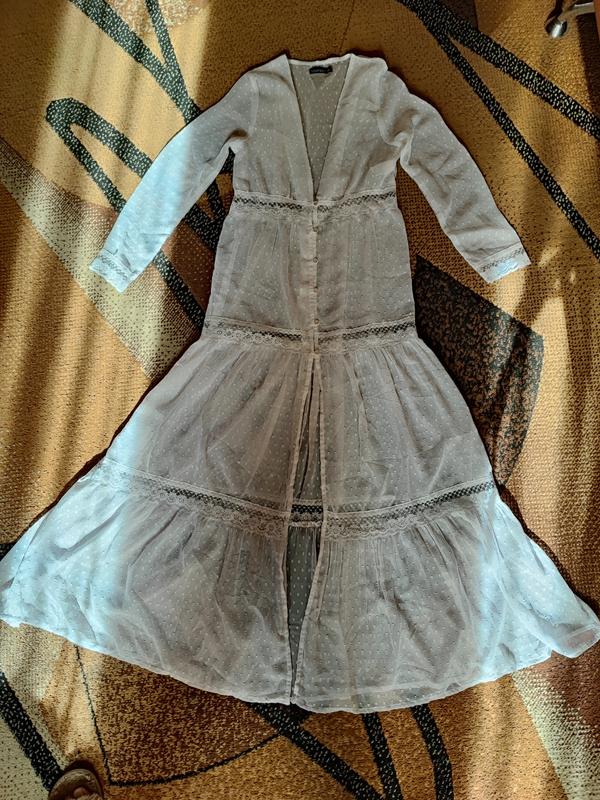Брендовая туника-халат свободного прямого кроя с рукавом. На пуговичках . С ажурными кружевными вставками. Туника-халат становится все более актуальной на морских побережьях. Можете носить поверх другой одежды. Туника из нежного , мягкого, воздушного материала из тончайшего волокна. В плечах 36 см. Длина рукава от плеча 60 см. Длина по спинке 138 см. ПОГ-ПОТ-ПОБ 44-38-52 см. Смотрится потрясающе, очень стильно и эффектно. Абсолютно новая вещь без бумажной бирки. Следы ношения отсутствуют. Дефектов нет.