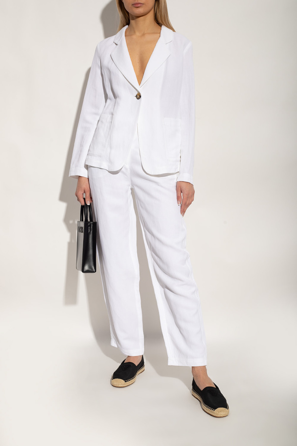 Black espadrilles from Emporio Armani. Made of fabric, this model sits on a woven jute sole with a brown rubber trim and features a logo patch on the front.