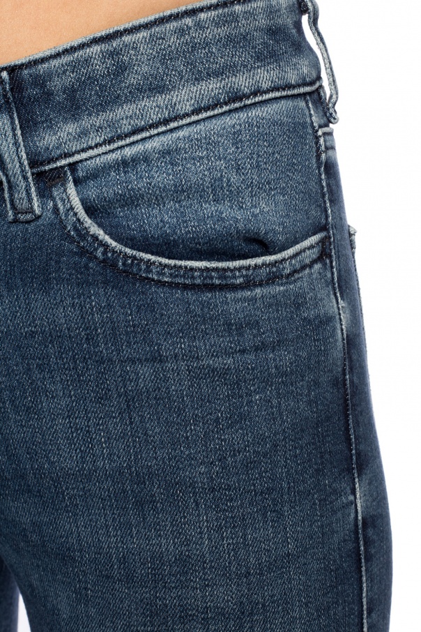 Blue ‘Slandy’ jeans from Diesel. Fastened with zip and button. Embellished with distressed detailing and metal appliqué. They feature 4 slip pockets and tapered legs.