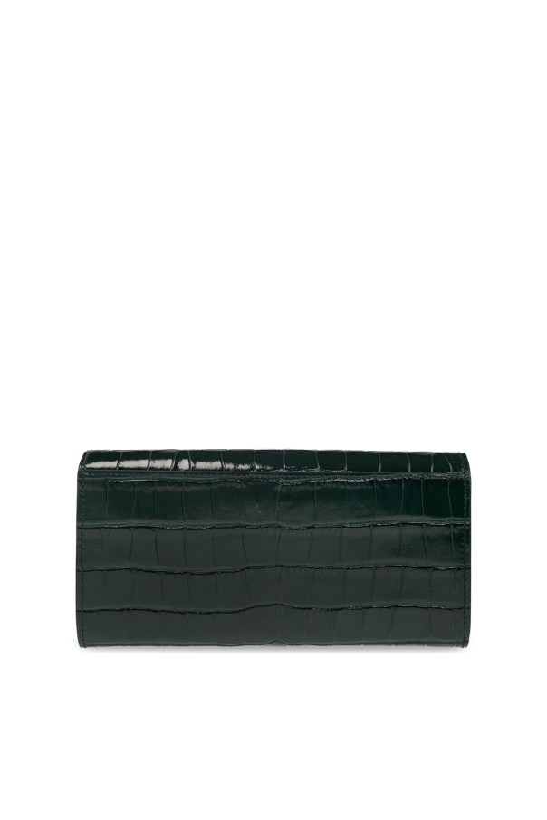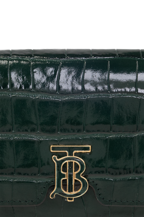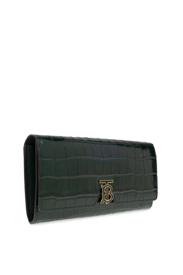 Dark green wallet from Burberry. Crafted from patent calf leather with a crocodile skin effect, this item fastens with a monogram snap and features a back slip pocket, gold-tone metal hardware and two bill compartments, one zip pocket and twelve card slots inside.