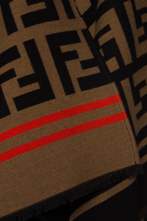 Brown and black, patterned poncho from Fendi. Made of wool and silk blend. Enriched by embroidered logo. Fringe edges.
