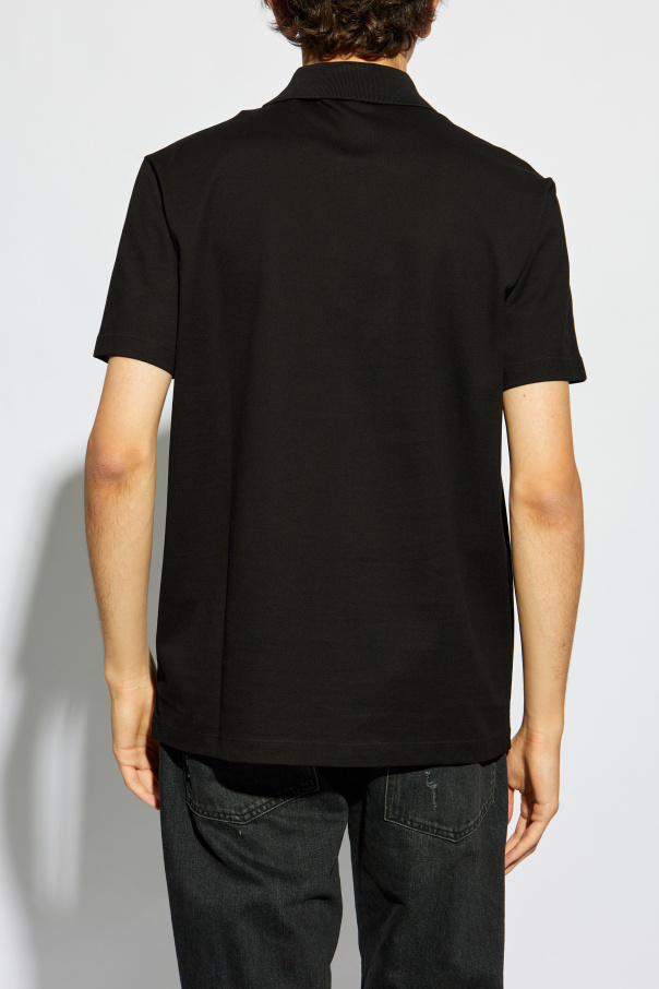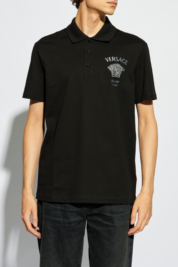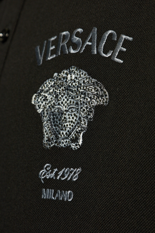 Introducing the epitome of luxury in everyday wear: the Versace Logo Polo. Crafted with precision, this iconic black polo shirt is a testament to timeless style and sophistication. Made from the finest cotton, its smooth fabric ensures both comfort and durability, making it a staple piece in any discerning wardrobe. The hallmark of this exquisite polo is undeniably the embroidered Medusa head logo, accompanied by the brand’s name, founding year, and origin city. Situated prominently on the chest, this emblem is not just a symbol of high fashion; it is a statement of heritage and unparalleled design prowess. The classic round neckline with a collar and a button placket further accentuates its elegant silhouette, while the short sleeves provide a relaxed fit. Detailing such as the meticulously embroidered logo adds texture and an air of exclusivity, making the Versace Logo Polo a true masterpiece of clothing design. Its versatile black hue allows for seamless integration into any ensemble, elevating your look with a touch of prestige. Why Purchase This Product? Exemplifies sophisticated, timeless design. Made from high-quality cotton for ultimate comfort. Features the iconic, detailed Medusa head logo, enhancing its exclusivity. Versatile and elegant, perfect for various occasions. A distinguished piece from a world-renowned designer, Versace.