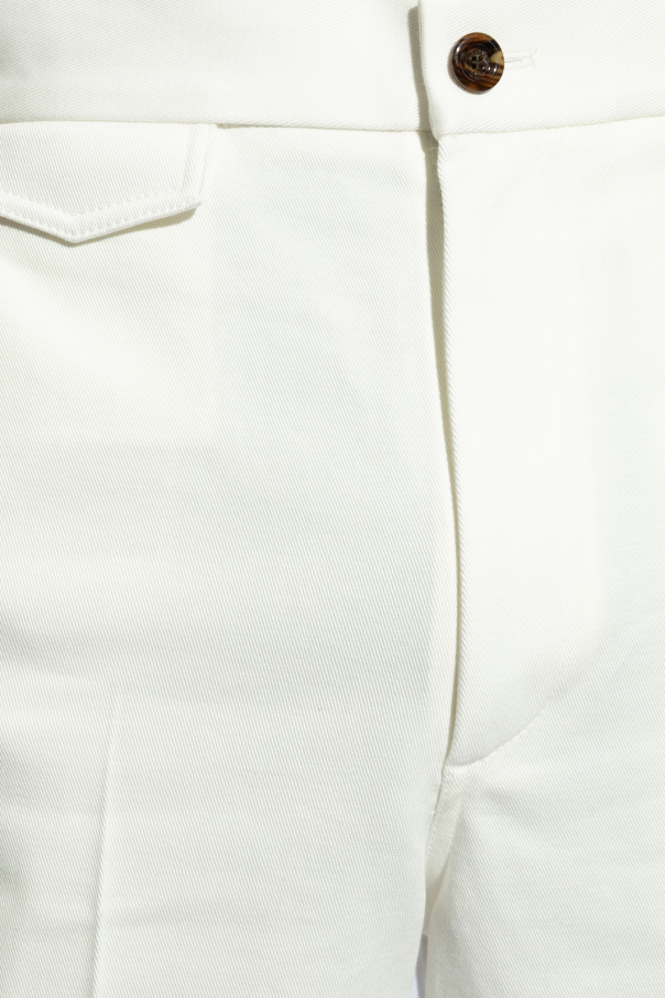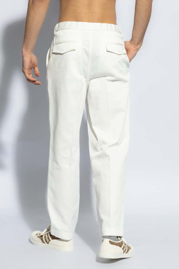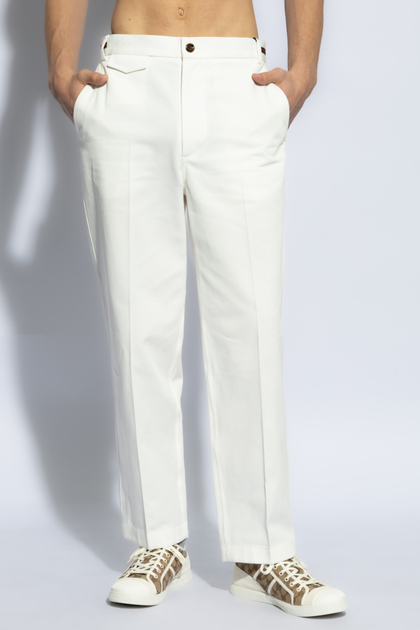 Introducing an exquisite addition to any discerning gentleman\'s wardrobe: the Gucci Straight-Leg Cotton Trousers. Crafted from a premium, thick cotton fabric, these trousers exemplify luxury and durability. The dominant hue, a sophisticated shade straddling the line between pure white and soft cream, ensures versatility and timeless elegance. The trousers boast a sharply tailored straight-leg cut, accentuated by a pronounced crease that lends an air of formal sophistication. The fabric\'s visible texture underscores the garment\'s quality and durability, while classic details such as a button and zipper closure, belt loops, side pockets, and flap back pockets enhance functionality without compromising style. A striking contrast is provided by the dark brown or black button, adding a subtle yet impactful touch of distinction. Exemplary craftsmanship is evident in the precise stitching and meticulous finishing, hallmarks of Gucci\'s commitment to unparalleled quality. Worn by a model of statuesque proportions (193cm in height, with a well-balanced physique), the trousers showcase their flattering fit and the elegant drape of the fabric, confirming their place within an exclusive clothing collection. Why Purchase This Product? Exquisite Material: Crafted from high-quality, durable cotton with a distinct texture. Elegant Design: Straight-leg cut with a pronounced crease, embodying sophistication. Attention to Detail: Classic features complemented by precise stitching and finishing. Versatile Color: A refined hue that bridges white and soft cream, ensuring adaptability across various styles. Luxury Brand: A testament to Gucci\'s legacy of luxury and attention to detail.