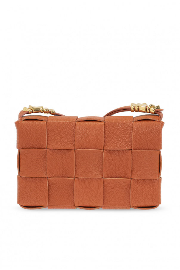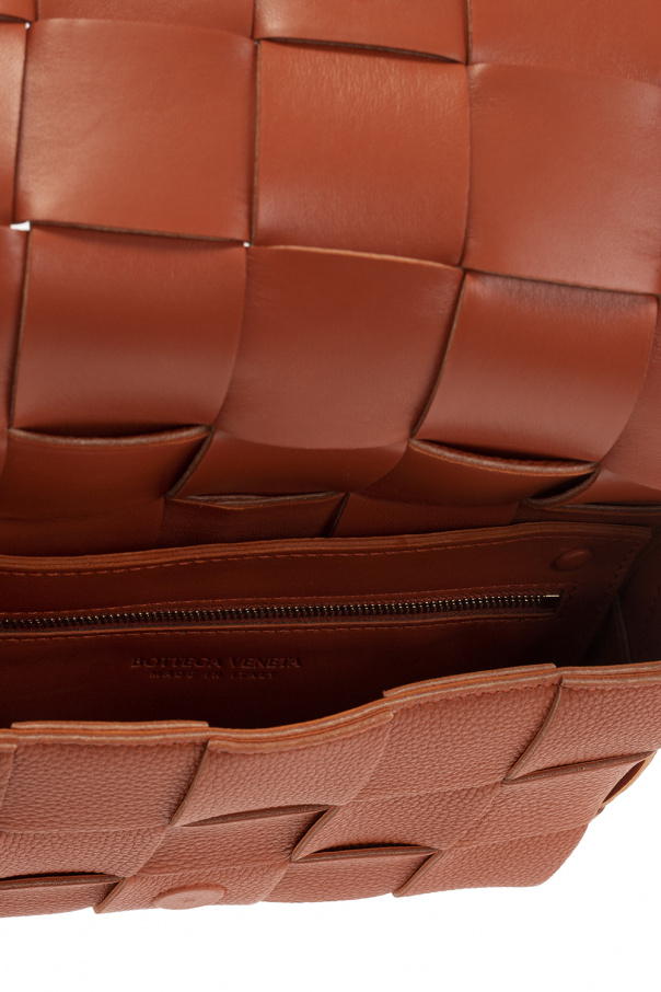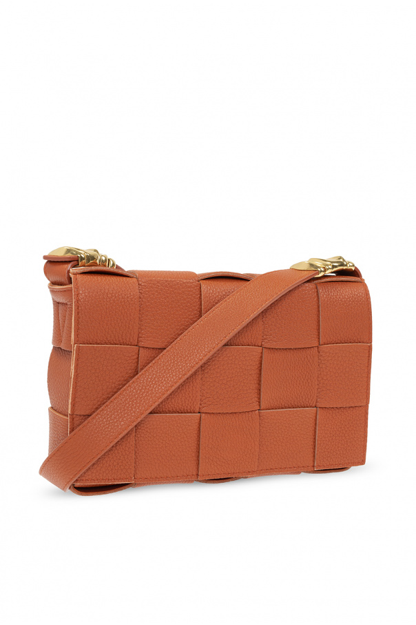 Orange ‘Casette’ shoulder bag from Bottega Veneta. Crafted from lamb leather with the label’s signature Intrecciato weave, this model features a flap with a magnetic closure, an adjustable shoulder strap, gold-tone metal hardware and one internal compartment with one zip pocket.