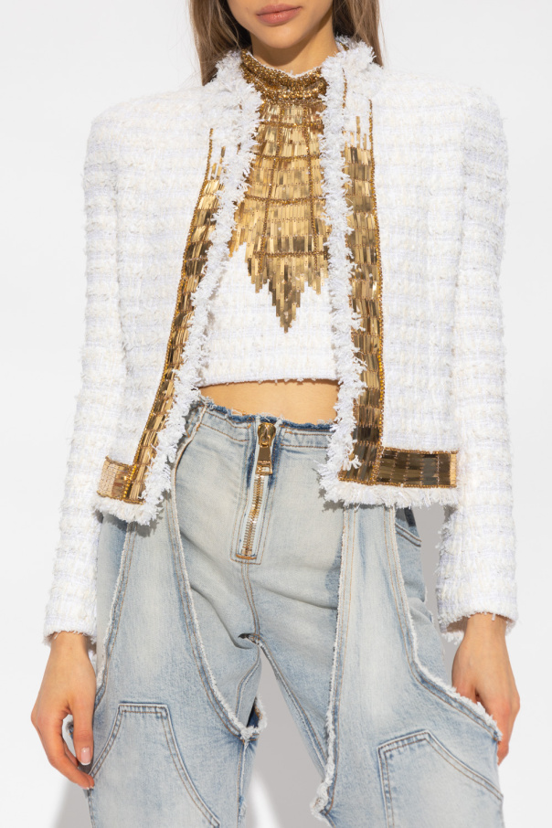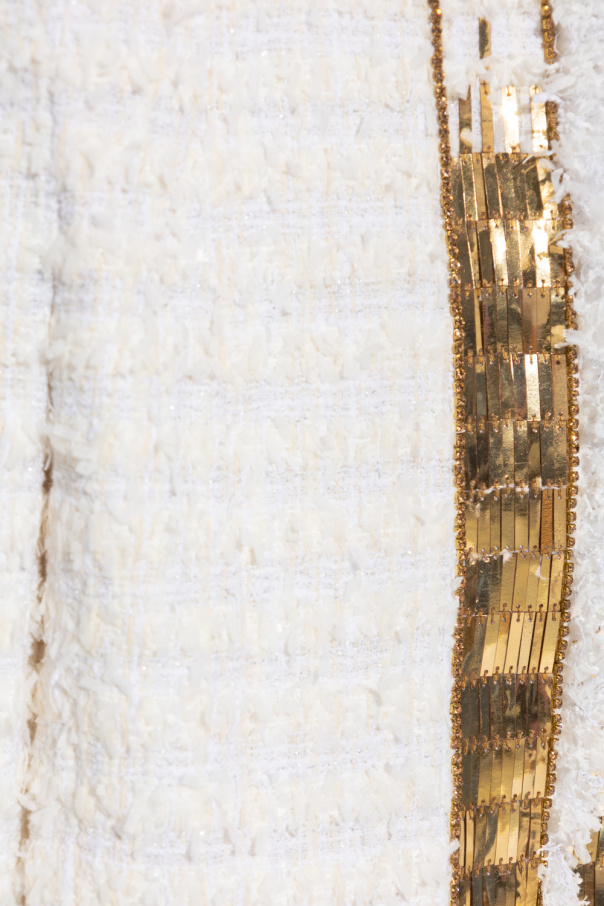 White jacket from Balmain. Made of tweed inlaid with metallic threads, this garment features gold-tone sequin and crystal appliqués, padded shoulders and long sleeves with cuffs fastened with buttons enriched by the brand’s signature lion head detail.