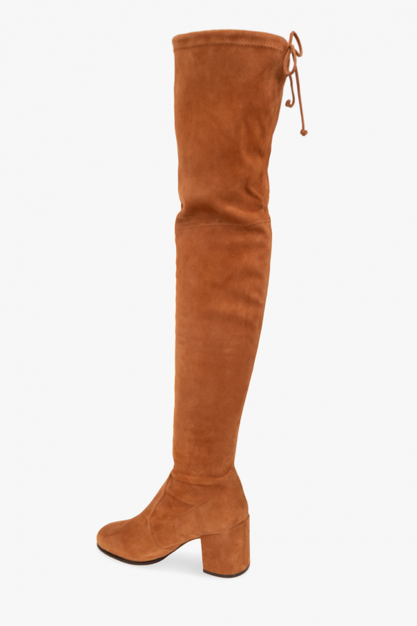 Brown ‘Tieland’ over-the-knee boots from Stuart Weitzman. Made from the designer\'s signature stretchy suede, this model features a drawstring hem, a round toe and a dark brown rubber sole.