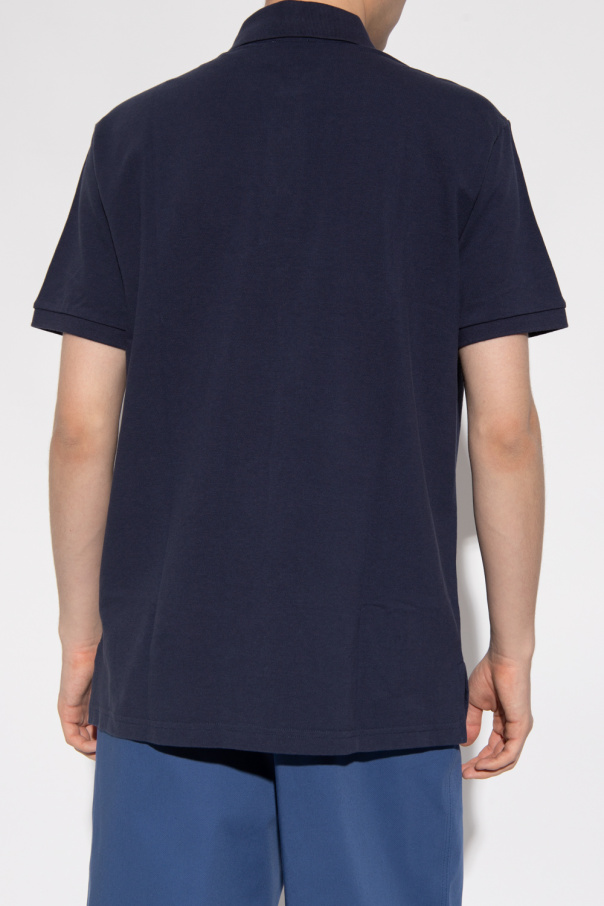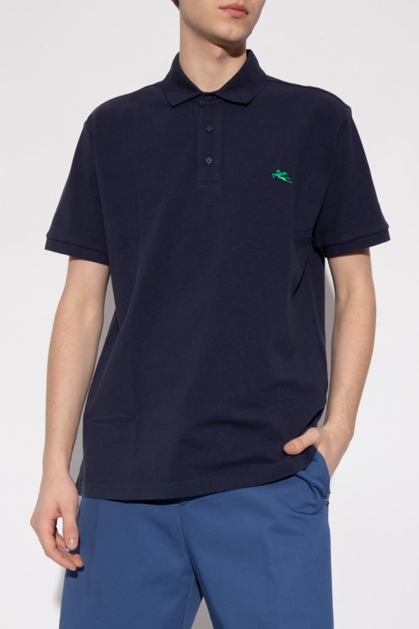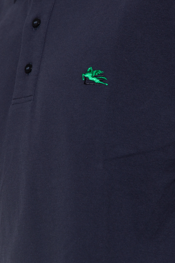 Navy blue polo shirt from Etro. Made of cotton, this style features a button placket, short sleeves, bottom side splits and green and black ‘Pegaso’ logo embroidery on the front.
